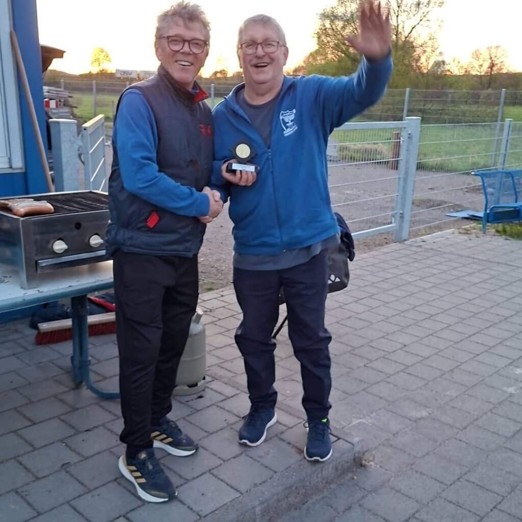 Foto: Haspel-Vorstand Rudi Klaus gratuliert dem Turnier-Sieger Karl Gessner (rechts)